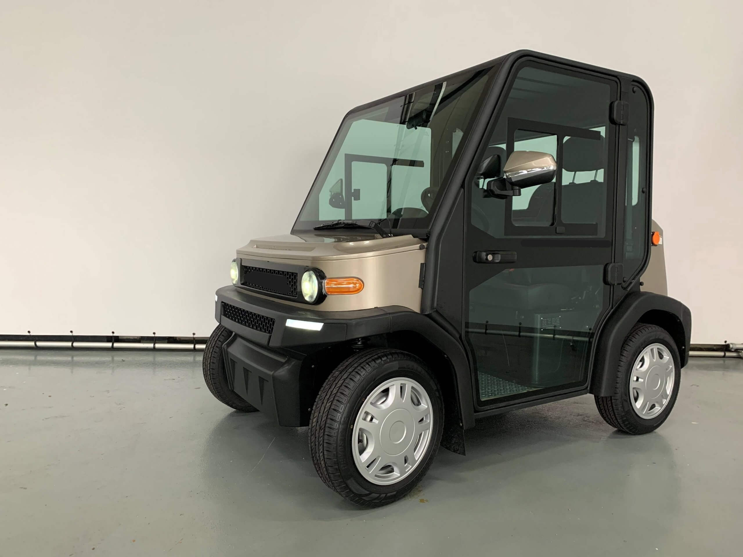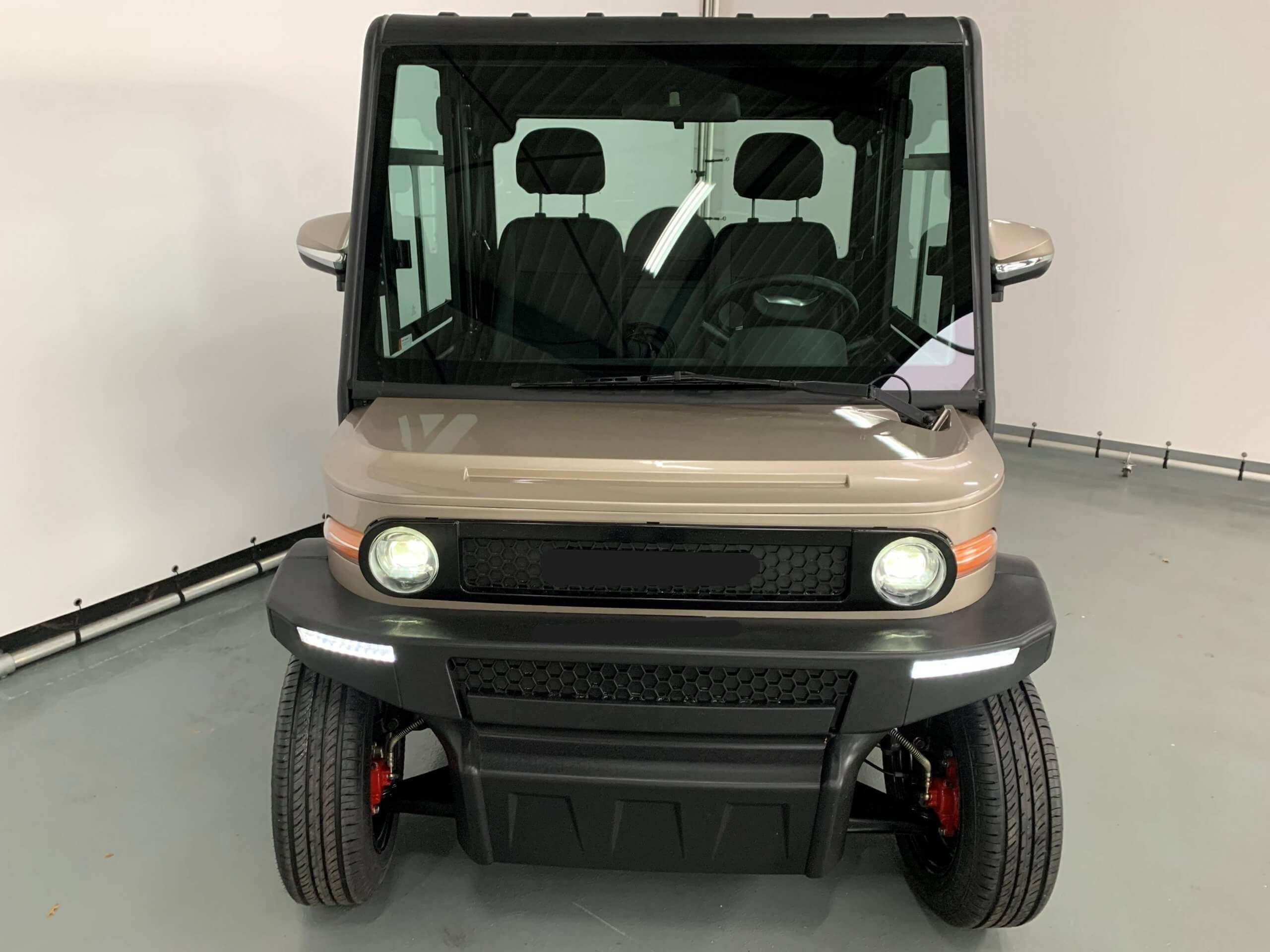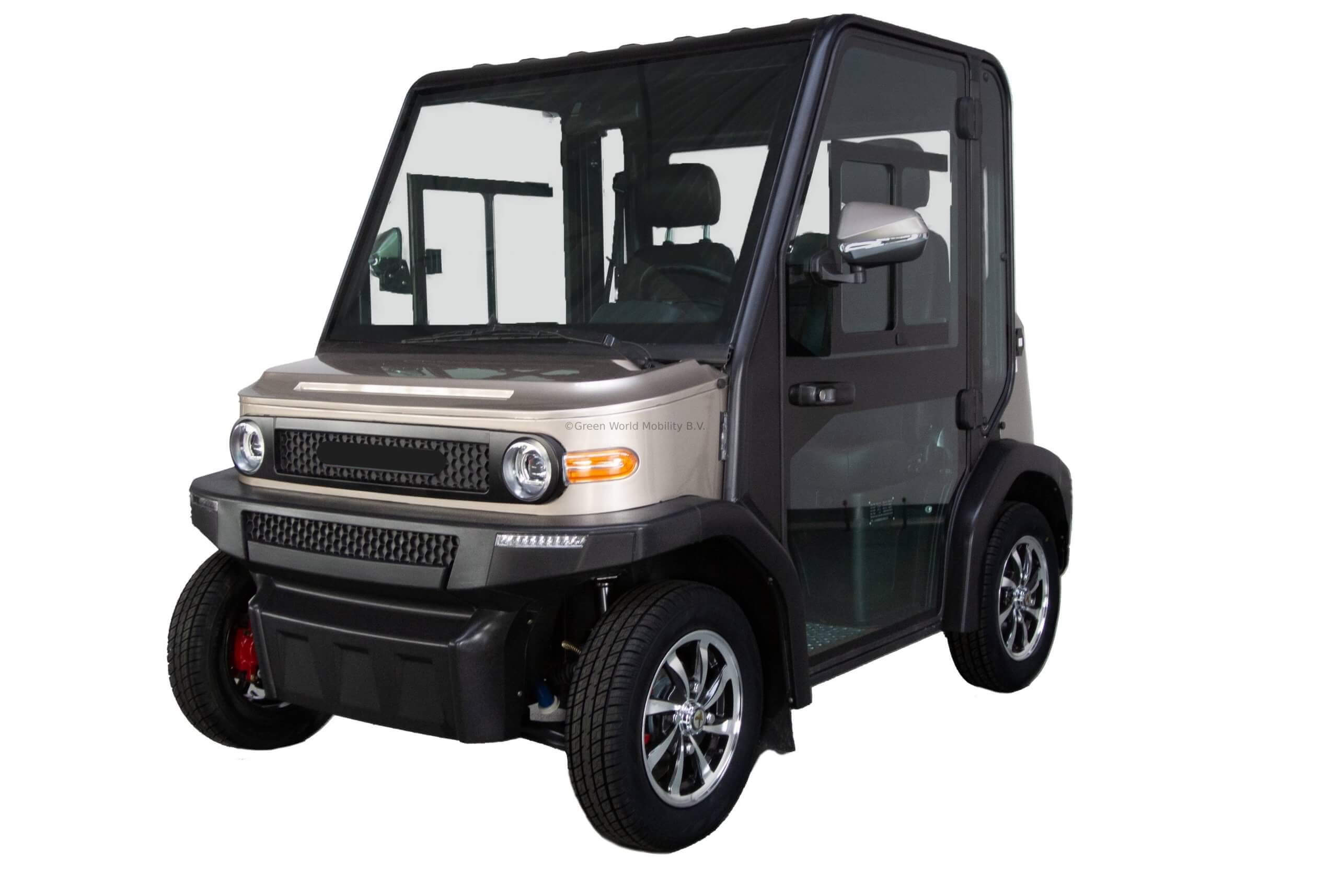 The Air Conditioned cart is a 2 Seater Golf Cart powered by a 5KW Drive System with Regenerative Braking. This closed 2 seater AC golf cart comes standard with a 4 Wheel Disc Brakes, Power Steering, Power Windows, LED Low and High Beam Headlights, Air Conditioning, Heat, Wipers and Turn Signals.
