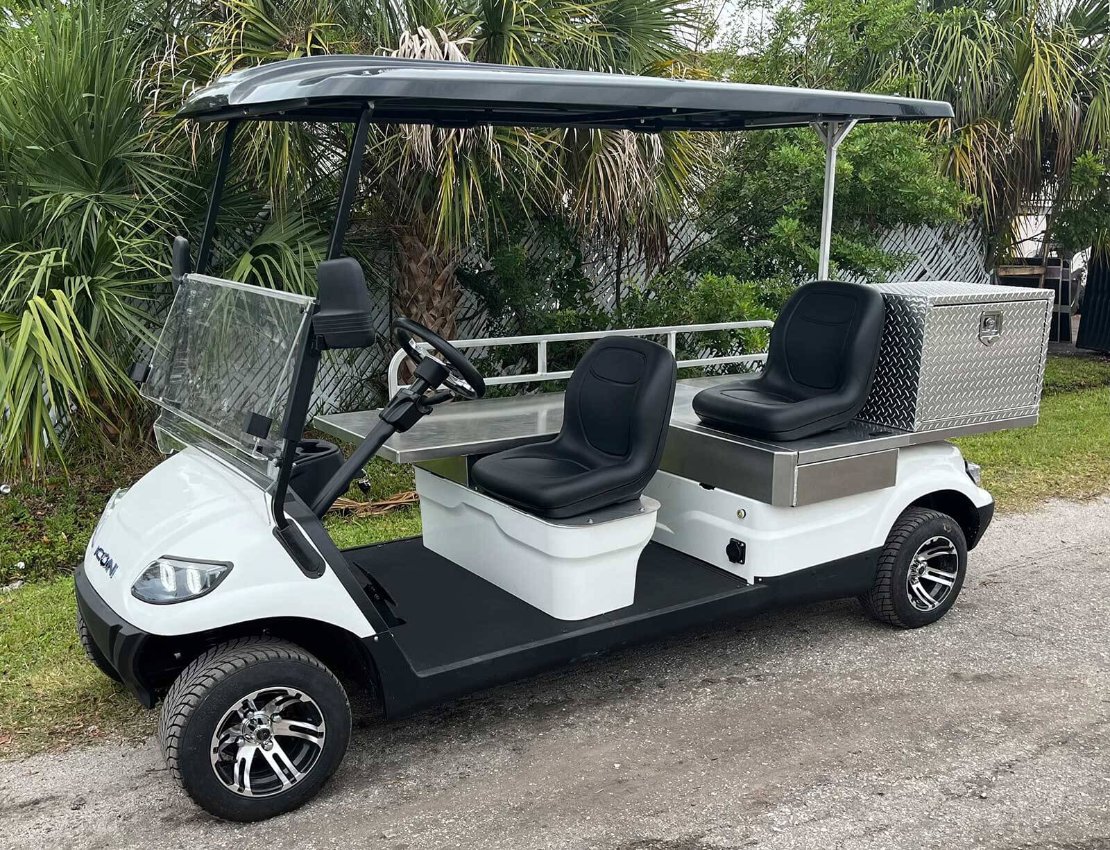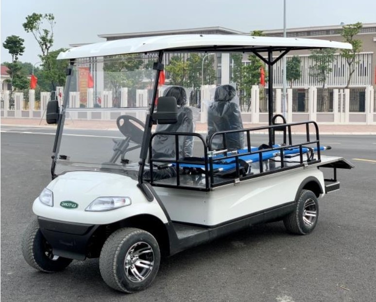 The first responder emergency medical golf cart comes equipped with a locking cargo box to store emergency medical supplies, an emergency strobe light, and a narrow side stretcher with mounts for safe patient transport.